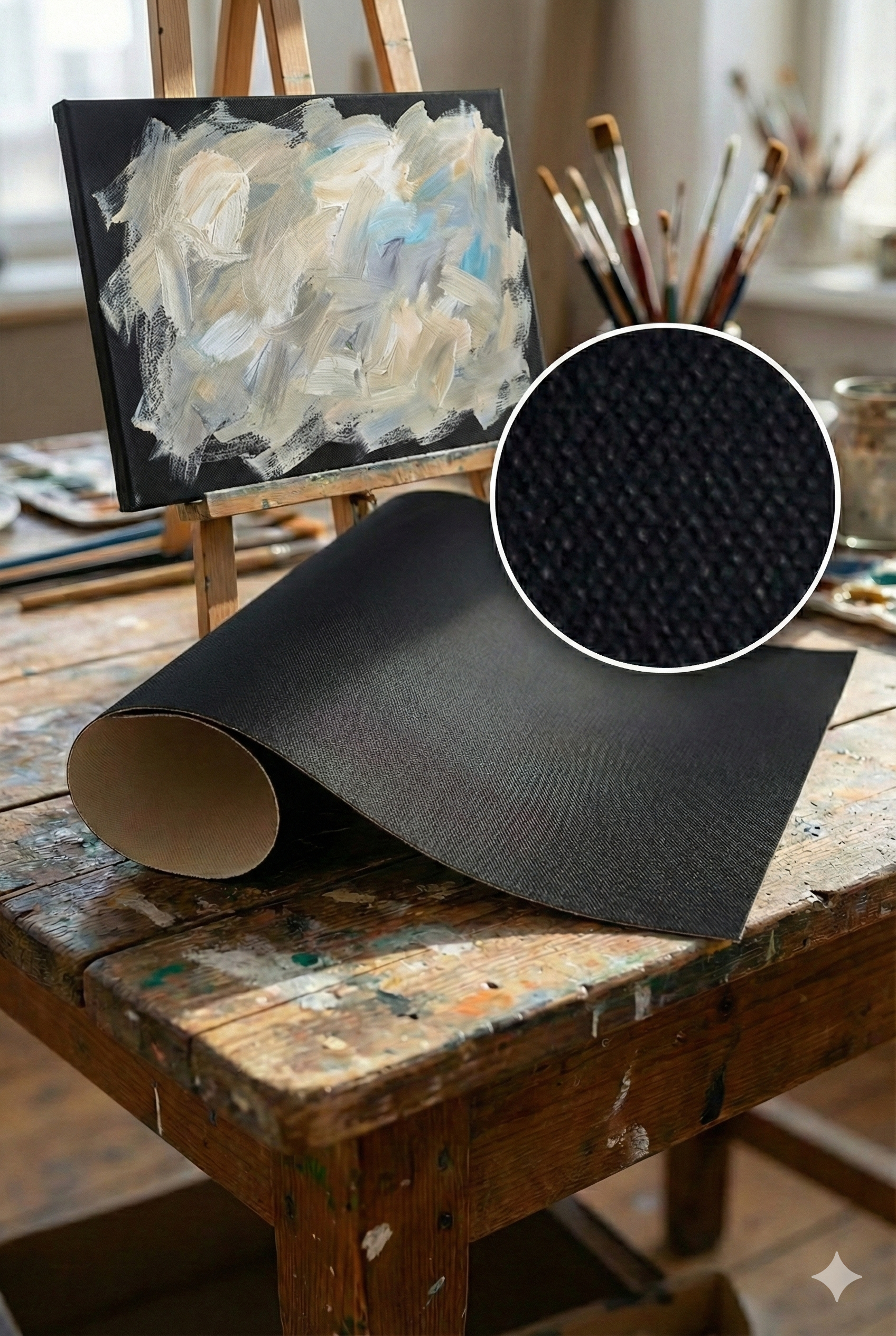 This unusual medium weight cotton canvas is primed with an acrylic based black primer, ideal for the painter who doesn't want to start from a white base. Suitable for both oil and acrylic paints.